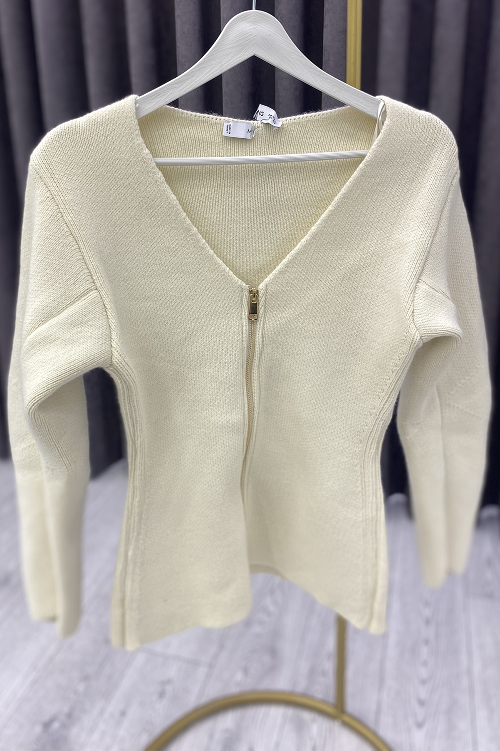 Krem V Yaka Fermuarlı Triko Hırka 3277